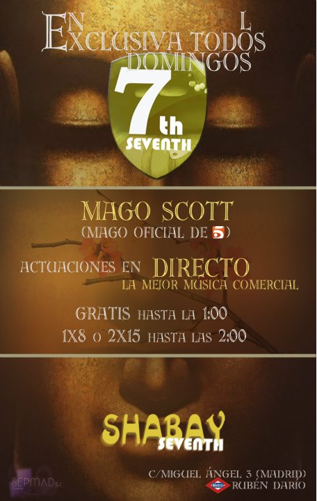 Los organizadores de la discoteca SHABAY SEVENTH de Madrid, nos encargaron un Flyer, para las sesiones SEVENTH durante varios fines de semana consecutivos.